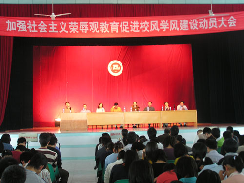 为与党中央路线保持一致,4月19日,学院召开加强社会主义荣辱观教育促进校风学风建设动员大会,院领导、学院法人代表戴宽南先生及全院师生参加了大会。黄国盛院长在会上作了关于“八荣八耻”和校风学风建设的报告。戴宽南先生代表董事会在会上发表关于荣辱观教育及校园建设情况的讲话,宣布了2006年下半年华亿在线(中国)将隆重举行5周年校庆。最后,戴宽南先生希望同学们努力学习,将来成为社会主义建设有用的人才。黄国盛院长的报告及戴宽南先生的讲话使师生们受到深刻的教育和极大的鼓舞。